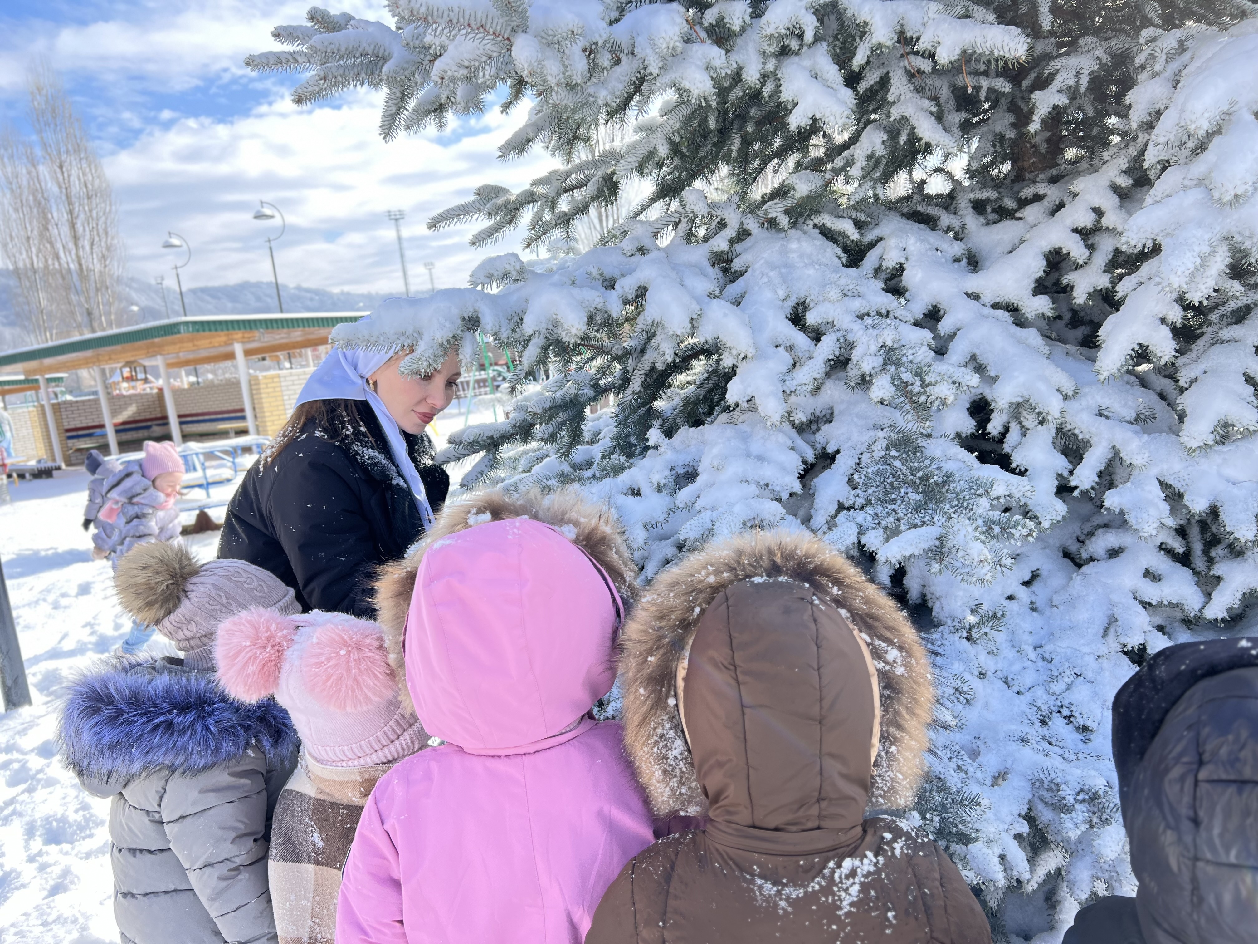 На участках для каждой из групп обустроены теневые навесы, игровые малые формы, общая спортивная площадка.