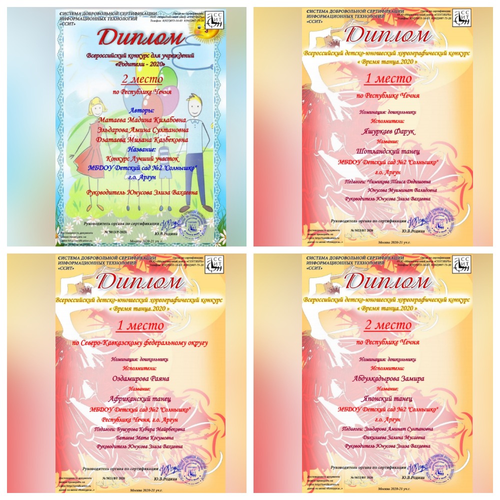 22.03.2021Воспитанники детского сада "Солнышко" заняли призовые места во Всероссийском детско-юношеском хореографическом конкурсе "Время танца.2020". Поздравляем ребят! Также диплом за 2-е место получил детский сад "Солнышко" за участие во Всероссийском конкурсе для учреждений "Родители-2020"