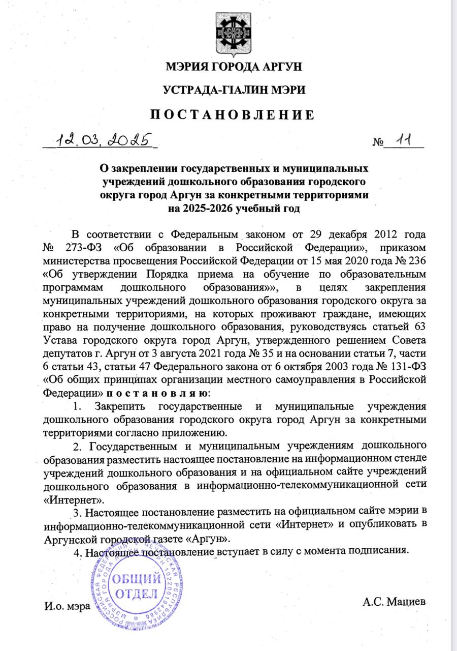 Постановление Мэра города Аргун О закреплении государственных и муниципальных учреждений дошкольного образования городского округа город Аргун за конкретными территориями на 2025-2026 учебный год