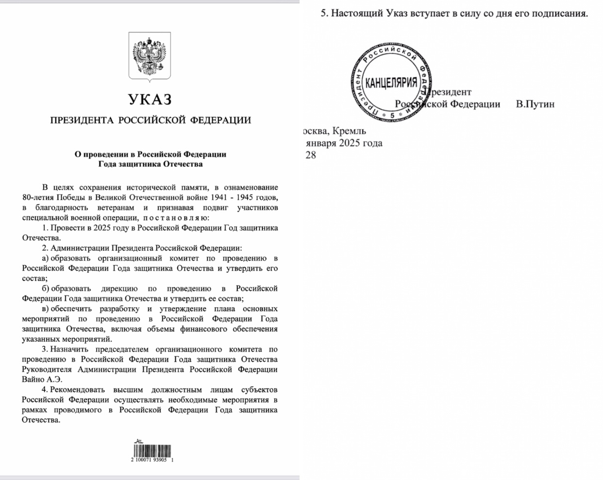 Указ Президента Российской Федерации «О проведении в Российской Федерации Года Защитника отечества